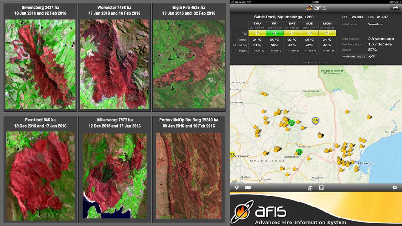 The Advance Fire Information System (AFIS) is an integrated ICT solution developed and owned by the Council for Scientific and Industrial Research (CSIR) and provides operational near real-time information for the prevention, monitoring, management and assessment of wildfire as a risk or hazard to society on a local, regional and global scale.
